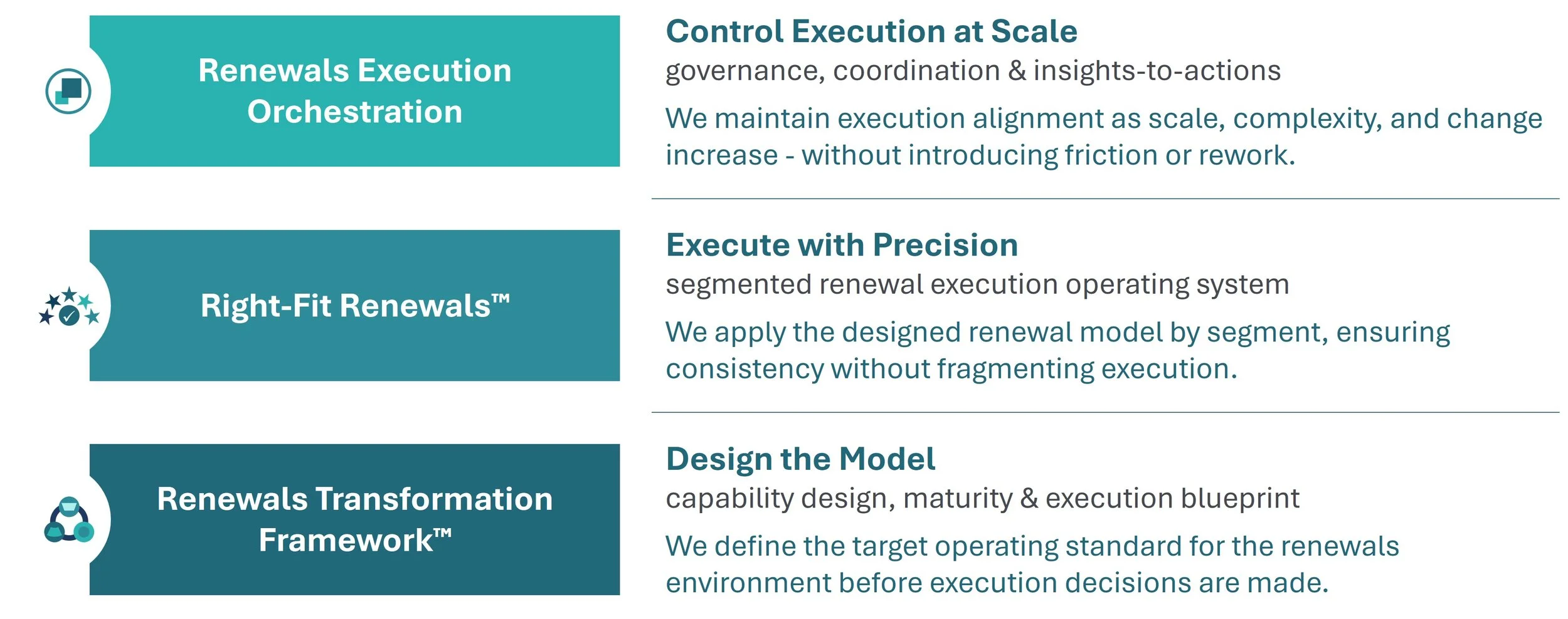 These engagement models are designed to operate independently or in combination, depending on where your renewals system requires attention.